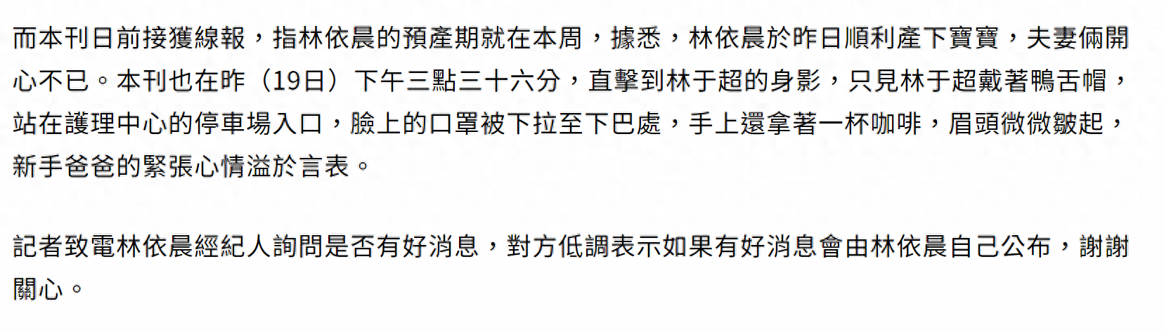 10月20日,台媒爆料称,林依晨已于19日顺利生产,生下了一个天秤座宝宝,夫妻两人开心不已,引起网友围观祝福。