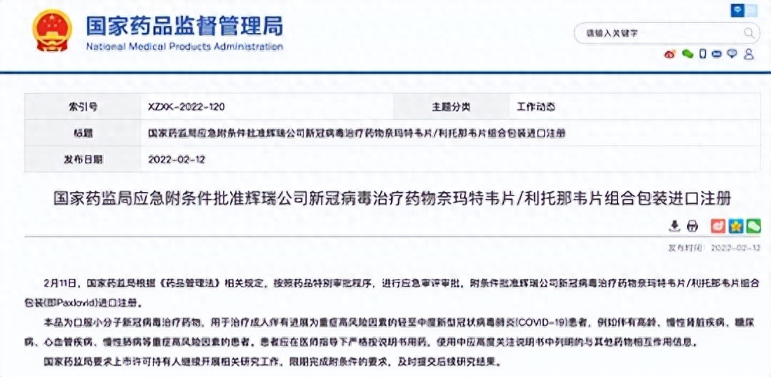3、国家药监局应急附条件批准辉瑞公司新冠病毒治疗药物奈玛特韦片/利托那韦片组合包装进口注册。国家药品监督管理局,XZXK-2022-120。