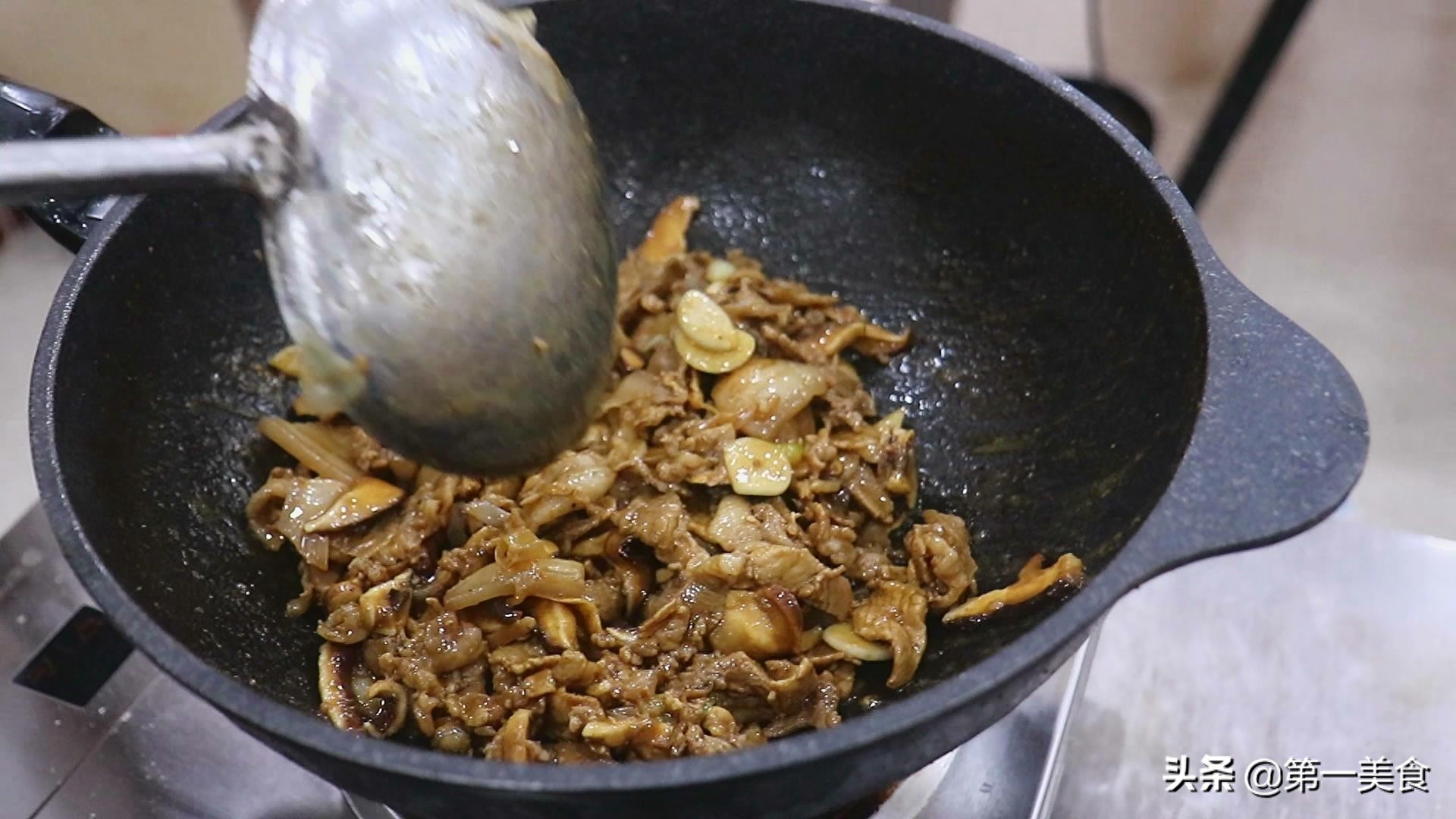2.锅里烧油,油烧热以后放入肉片进行煸炒,把肉片煸香、煸出油,放入葱片炒出香味,加入生抽提鲜、一点老抽上色、食盐、鸡粉、胡椒粉调味,继续翻炒化开调料,然后把香菇放进去,一块把颜色炒均匀。