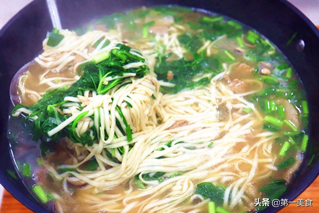 3.接着倒进去半锅清水,转大火烧开,把面条抖散放进去,经常用筷子搅一搅省的粘连,面条煮至没有硬芯的时候把荠菜往里面一撒,稍微烫个二三十秒钟,香味出来以后就管舀着吃了,香喷喷类吃着是真舒服。