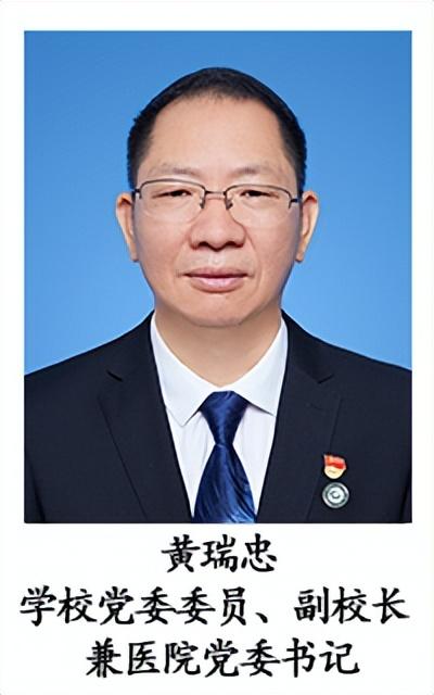 党委书记:黄瑞忠,男,1968年10月出生,中共党员,省委党校研究生学历。曾任赣南医学院党委委员、组织部部长、副院长等职。现任学校党委委员、副校长兼医院党委书记。
