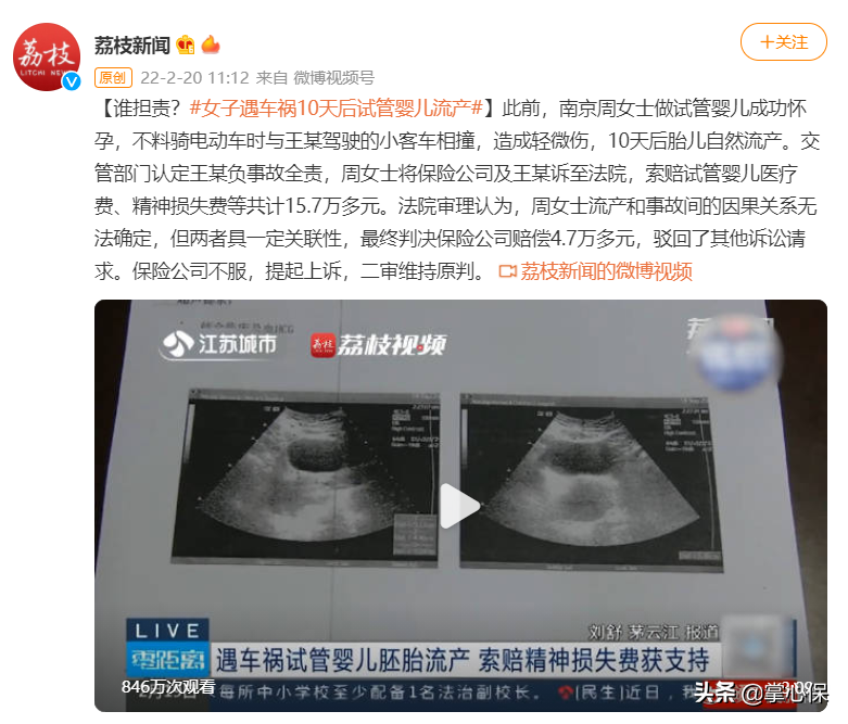 前几天就有一则新闻,南京周女士做完试管婴儿成功怀孕没多久,在骑电动车时不幸和一辆小客车相撞,10天后胎儿自然流产。