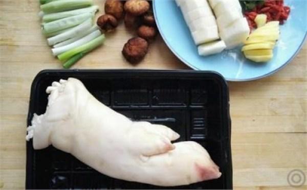 取猪蹄750克去毛洗净,剁成块,放在瓦煲里:再放入开水2500克;加入鲜山药50克、枸杞25克,等到煮沸以后改用中火煲至熟透;之后加入适量的盐入味,最后撇去汤面的油即可。