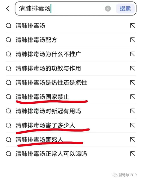 因为不敢相信这个结果,所以我又重新搜索了一次“清肺排毒汤”,这次弹出来的关联消息,更是让我震惊: