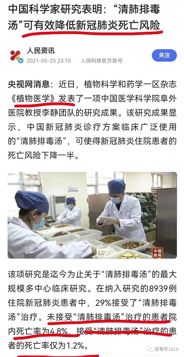2021年的时候,《植物医学》这家学术期刊发表了一个数字,关于清肺排毒汤效果的数据:接受清肺排毒汤治疗的患者死亡率1.2%,未接受者死亡率4.8%,是前者的4倍,4倍是什么概念?