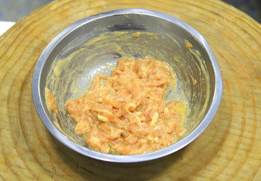 1.准备猪瘦肉200克,切成肉丝放入盆中,加入食盐1克,鸡粉2克,胡椒粉1克,老抽2克,料酒5克,多搅拌一会儿,把料汁全部打入肉丝里面,放入半个鸡蛋清,搅拌均匀,抓入一小把淀粉,搅拌摔打2分钟,再加入少许植物油,继续拌匀备用。