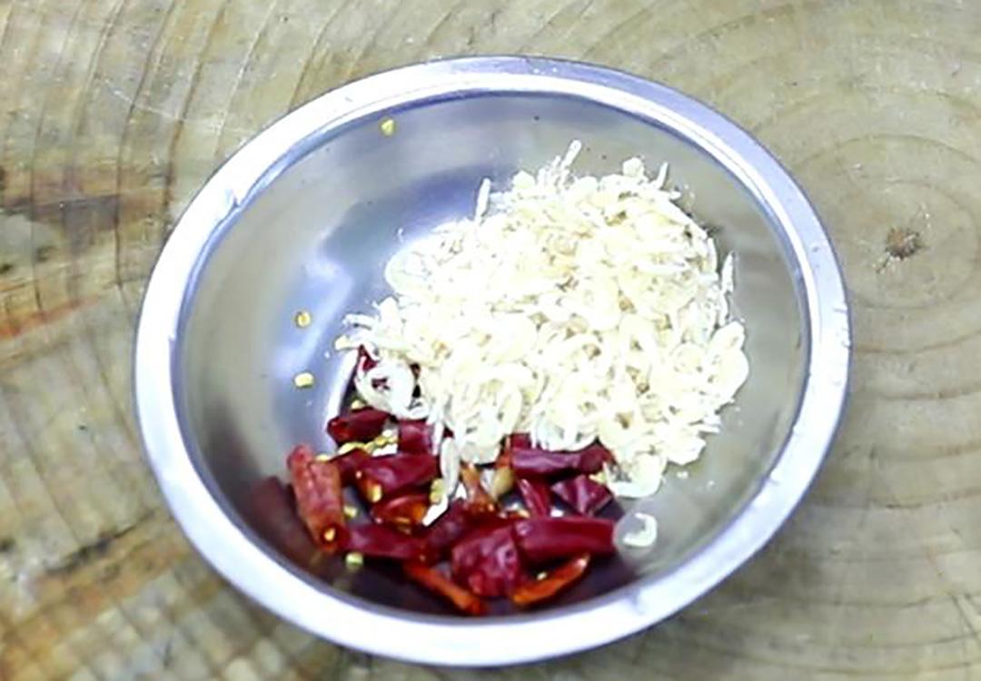 1.准备一小把大蒜,拍扁切成蒜末;几个干辣椒切成段,再放入一小撮虾皮备用。