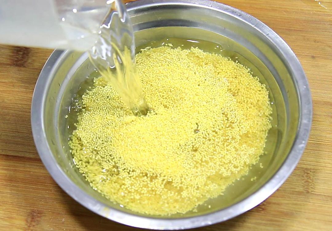 1.准备一把小米,淘洗干净以后用清水浸泡10分钟,浸泡过的小米熬的时候更容易熟透。