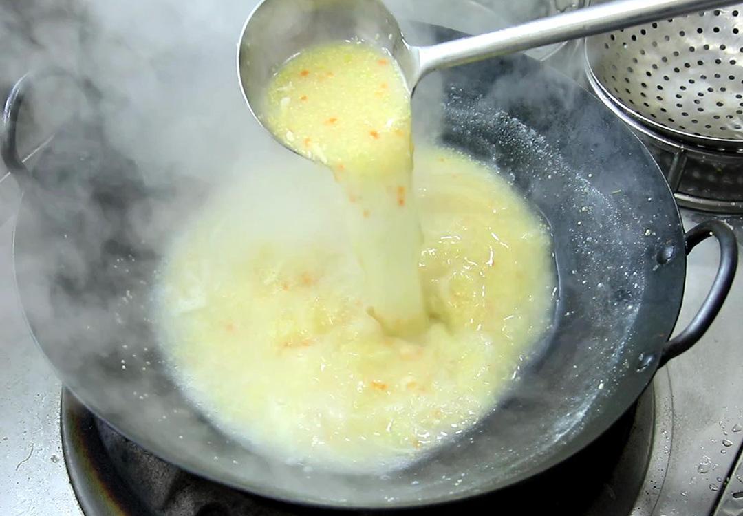 4.打去锅中的浮沫,小米全部开花以后转为小火继续煮20分钟,随着煮制的时间增长,小米粥会慢慢变得粘稠,要用勺子经常搅动防止糊底。小米粥变得浓稠、漂油花以后加入食盐和鸡粉调味,继续搅拌小火慢熬,一直把米粥熬至浓稠成米糊状。
